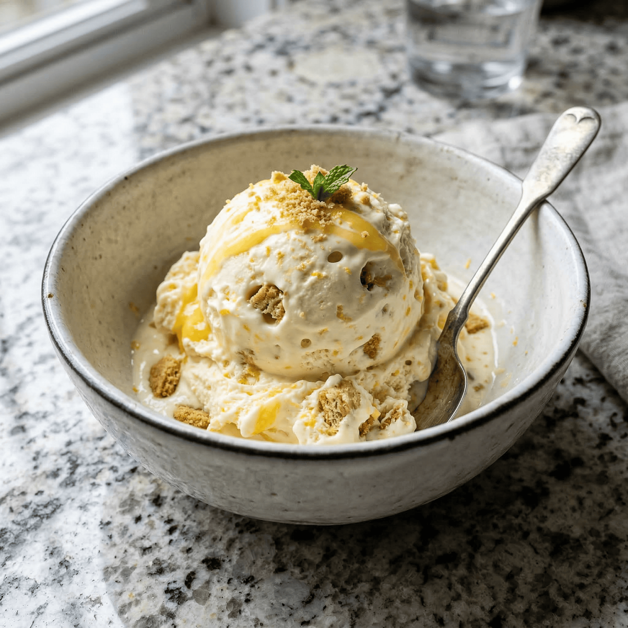 - Stelle sie für einige Stunden in den Gefrierschrank. Danach ist dein selbstgemachtes Lemon Cheesecake Eis fertig.