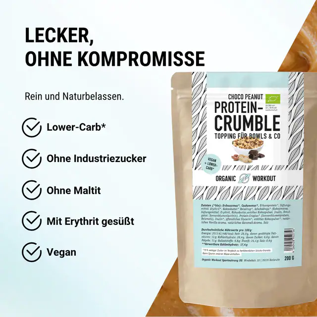 *bio: Erdnussmus*, Cashewmus*, Erbsenprotein*, Süßungsmittel: Erythrit*, Kakaobutter*, Reissirup*, Schokodrops* (Kakaomasse, Süßungdsmittel: Erythrit, Kakaobutter, entöltes Kakaopulver, Inulin, Emulgator: Sonnenblumenlecithin) Protein-Crispies* (Sonnenblumenprotein, Reismehl), Inulin*, pflanzliches Glycerin*, entöltes Kakaopulver*, natürliches Vanille-Aroma, natürliches Karamell-Aroma, Salz