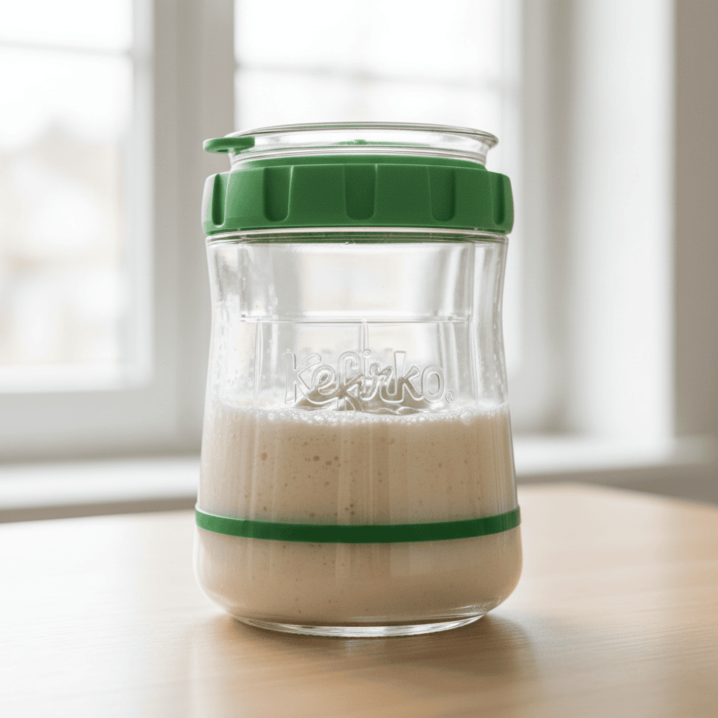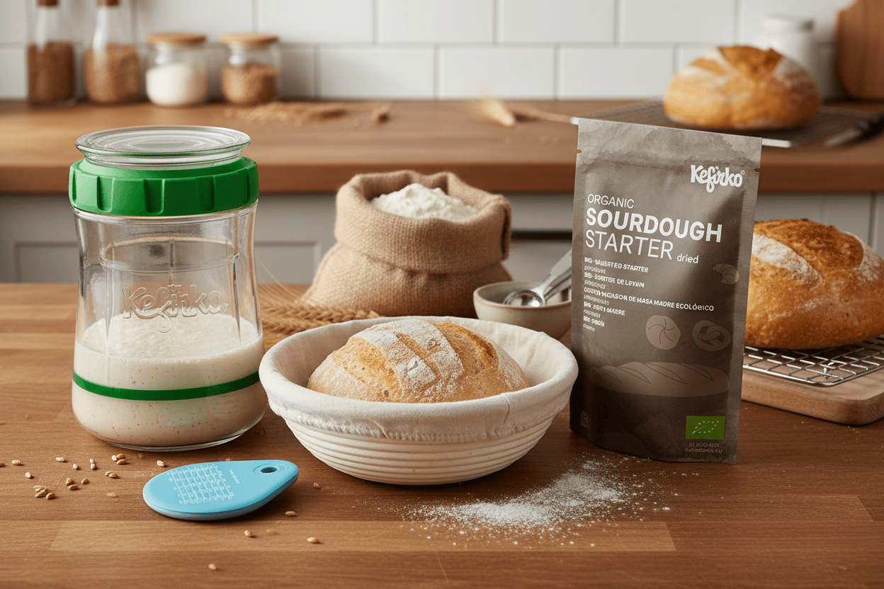 Dieses Set enthält alles, was du brauchst, um deinen eigenen, natürlichen Sauerteig zu züchten – vom biologischen Starter bis zum hochwertigen KefirKo Sauerteig Fermenter.