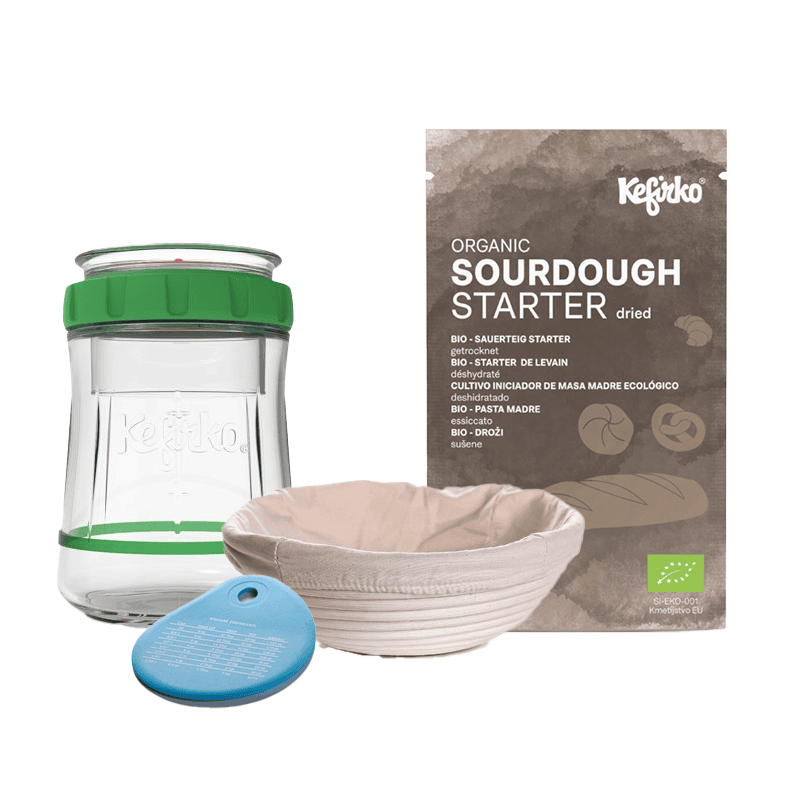 Dieses Set enthält alles, was du brauchst, um deinen eigenen, natürlichen Sauerteig zu züchten – vom biologischen Starter bis zum hochwertigen KefirKo Sauerteig Fermenter.